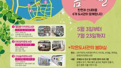 파주시 탄현도서관, 작은도서관 협력사업 ‘작은도서관의 봄마실’운영 파주시 탄현도서관은 5월 3일부터 7월 23일까지 작은도서관 활성화 지원의 일환으로 5개소의 작은도서관과 협력해 ‘작은도서관의 봄마실...