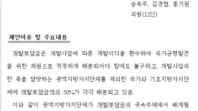 이재명 핵심공약 ‘개발이익 도민환원제’ 법제화 첫 발 나서 ○ 김철민 국회의원 24일 ‘개발이익환수에 관한법률’ 개정안 대표 발의 - 국가‧기초자치단체에만 귀속되는 개발부담금 20%를 광역자치단체에 배분하는 내용 ...