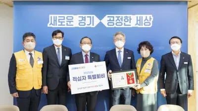 이재명 지사, 대한적십자사 특별회비 1천만원 전달 ○ 23일 ‘2021년 대한적십자사 특별회비 전달식’ 개최 - 특별회비 1,000만원 전달, 전국 광역자치단체 중 가장 빨리, 최고액 전달 ○ 경기도, 대한적십자사에 그간 누적기부금 5...