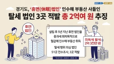 2020-11-09 05:42:20경기도, ‘휴면법인’ 인수해 부동산 사들인 탈세 법인 3곳 적발. 2억여 원 추징