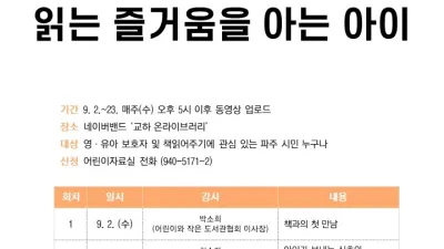 2020-09-01 05:21:50파주시 교하도서관 언택트‘북스타트 부모교육’ 운영 -읽는 즐거움을 아는 아이