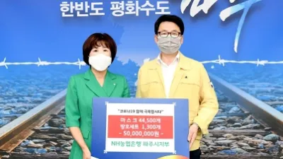 코로나19 극복 파주지역 기부, 선한 영향력 NH농협은행 파주시지부, 5천만 원 상당 방역물품 기부 파주시는 NH농협은행 파주시지부가 코로나19 극복을 위한 ‘착한 나눔운동’에 동참했다고 밝혔다. 권순옥 NH농...
