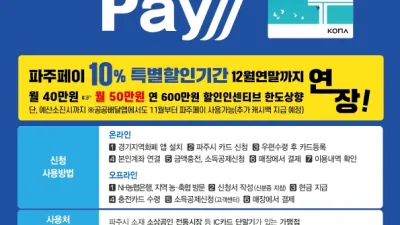 2020-09-01 05:12:36파주페이, 할인인센티브 한도상향 최대 50만원까지 - 50만원까지 10% 할인받으세요!