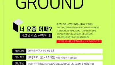 파주시 교하도서관, 코로나로 지친 파주시민을 위한 비대면 예술프로젝트 추진 -교하도서관x예술인 마을캔버스 프로젝트‘I AM GROUND’ 파주시 교하도서관은 비대면 예술프로젝트를 9월부터 본격 추진한다고 밝혔다...