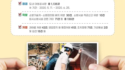 경기지역 대형공사장 10곳 중 1곳은 ‘안전불감증’ - 대형공사장 1.135곳 점검. 105곳이 불량판정 ○ 경기도소방재난본부, 5월11일~6월25일 추진한 소방안전대책 결과 발표 - 대형공사장 특별안전점검, 소방관련업 지도‧감독, 공...
