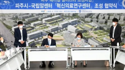 파주시-국립암센터, 혁신의료연구센터 조성 협약 체결 -‘파주메디컬클러스터’내 7만㎡ 규모 혁신의료연구센터 조성 파주시(시장 최종환)와 국립암센터 국제암대학원대학교(총장 이은숙)는 17일 파주시청 대회의실에서 &...