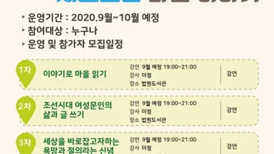2020-06-11 07:37:54파주시 교하도서관, 2020년 길 위의 인문학 ‘당신의 인생에 글쓰기를 더하다’운영