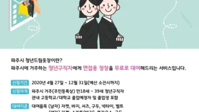 파주시, 청년드림옷장 사업 추진 면접 정장 무료 대여 서비스 파주시는 오는 4월 27일부터 파주시 청년구직자의 경제적 부담을 줄이고자 면접정장을 무료로 대여해주는 ‘파주시 청년드림옷장’ 사업을 추진한다. 신청대...