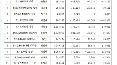 경기도 시군의원·공공기관장 평균재산 9억7,220만 원… 작년보다 5,801만 원 늘어 ○ 경기도공직자윤리위원회, 공공기관장 12명, 시·군의원 446명 재산신고사항 공개 - 재산 증가자 324명(71%), 평균 1억3...