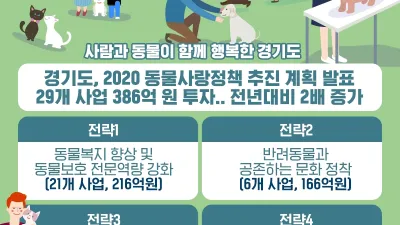경기도, 2020년 ‘사람과 동물이 공존하는 세상’ 위해 386억 투자‥전년대비 2배 증가 ○ 도, 26일 기자회견 통해 ‘2020 경기도 동물사랑정책 추진 계획’ 발표 ○ ‘사람과 동물이 함께 행복한 ...