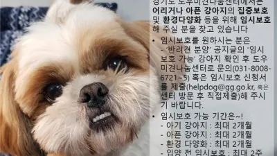 경기도 도우미견나눔센터 “유기견 임시보호로 생명사랑 실천하세요!” ○ 경기도 도우미견나눔센터, 2019년 12월부터 임시보호제 실시 - 임시보호 가정에 사료·용품 지원 및 수의사·훈련사 상담 서비스 제공 ○ 도...