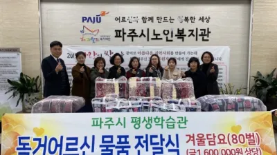 파주시 평생학습관 학습동아리, 독거어르신 겨울담요 전달식 진행 파주시 평생학습관 혜윰(의상 분야), 빵드림(제빵분야) 동아리는 지난 27일 관내 독거 어르신들이 따뜻한 겨울을 날 수 있도록 밍크 담요 80벌을 구입해 파주시 노인복지관에 전달했다...