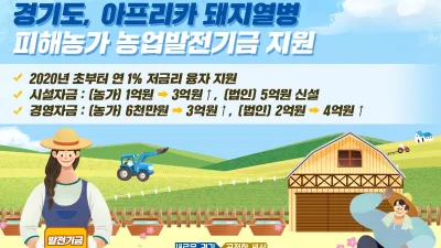 경기도, 아프리카 돼지열병 피해농가 농업발전기금 융자금 상향 추진 ○ 아프리카 돼지열병 피해농가에 한해 농업발전기금 대출한도액 상향 지원 - 시설자금 : (농가) 1억원 → 3억원, (법인) 미 지원 → 5억원 - 경영자금 : (농가) 6...
