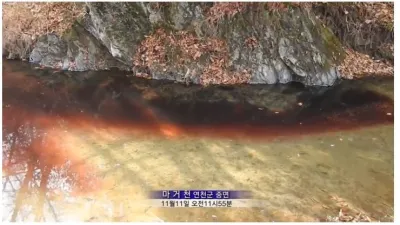 연천군 발생 침출수 임진강 유입 대비 금파취수장 취수 중단조치 11일 낮 경기도 연천군 중면 마거리 민통선 내 임진강 상류 마거천. 상수원보호구역과 인접한 하천이 인근 살처분 돼지 매몰지에서 흘러나온 침출수로 핏빛으로 변한 모습. ...
