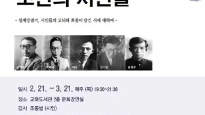 파주시 교하도서관 3.1운동 100주년 기획강좌 ‘자유를 꿈꾸던 조선의 시인들’개최 파주시 교하도서관은 3.1운동 및 임시정부 수립 100주년을 맞아 오는 21일부터 3월 21일까지 매주 1회 ‘자유를 꿈꾸던 조선의 시인들’ ...
