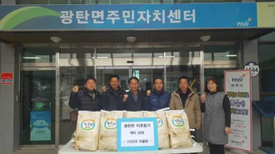 광탄면 기산2리 마을회, 연말연시 이웃돕기 물품 기탁 지난 20일 기산2리 마을회(이장 김영철)에서 10kg 백미 30포를 광탄면(면장 이승욱) 광탄면에 기탁했다. 이번 기탁된 물품은 관내 독거노인 및 생활이 어려운 기초생활 수급자 등 30가구에 전달될 예정이...
