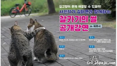 파주시는 오는 25일 14시부터 17시까지 파주시농업기술센터에서 시민들을 대상으로 ‘사진작가 김하연과 함께 하는 찰카기의 썰 공개강연’을 추진한다. 교육 내용은 길고양이 문제 해결 관련으로 ▲길고양이에 대한 편견과 오해 그리고 진실 ▲왜 ...
