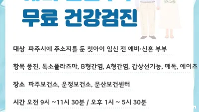 - 반려동물 기생충에서 유래한 '톡소플라즈마 검사'는 전국 최초 도입 파주시는 예비·신혼부부를 대상으로 무료 건강검사를 실시해 임신 전 건강 상태를 확인하고 건강한 가정을 이루도록 지원한다. 검사 대상은 파주시에...