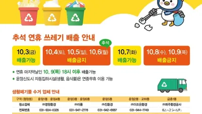 2025-09-29 13:21:01파주시, 추석 연휴 기간 쓰레기 수거 중단 알림 - 10월 4일~9일까지, 단 10월 7일은 수거작업
