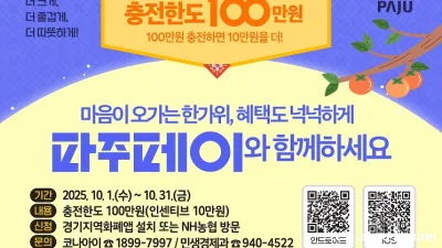 10월 추석 맞이 파주페이 충전한도 100만 원으로 상향 파주시는 추석을 맞이해 시민의 생활비 부담을 줄이고 지역경제에 활력을 불어넣기 위해 10월 1일부터 31일까지 한 달간 파주페이 충전 한도를 최대 ...