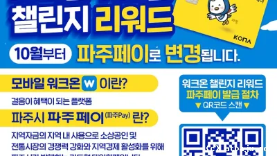 파주시민 건강도 챙기고 지역경제도 살린다 파주보건소가 시민 건강 증진과 지역경제 활성화를 위해 모바일 걷기 앱 ‘워크온 보상’ 지급 방식을 오는 10월부터 지역화폐 파주페이로 전환해 운영한다. 그동안 ‘워크온 걷기 챌린지’ 보상은...