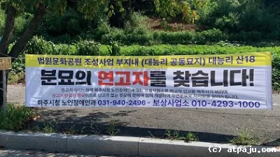 파주시, 법원읍 대능공동묘지 분묘 이전 막바지 단계 - 잔여 분묘 추석 연휴 기간 이후 최종 이전 완료 예정 파주시는 법원문화공원 조성사업의 일환으로 추진 중인 법원읍 대능공동묘지 내 유·무연분묘 879기에 대한 ...
