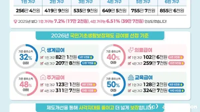-생계급여선정기준’25년195만1,287원→’26년207만8,316원(4인가구)-빠르게변화하고있는정부복지정책기조에발맞춰시민생활안전망강화 지난 7월 말 정부의 ’26년도 기준 중위소득 6.51%(4인 기준)&nbs...