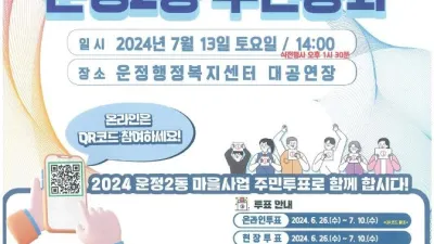 파주시 운정2동 주민총회 7월 13일 개최…주민 누구나 참여 ‘2024년 제4회 운정2동 주민총회’가 오는 13일 14시 운정행복센터 대공연장에서 개최된다. 주민총회는 운정2동 주민들과...
