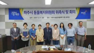 ‘파주시 동물복지위원회’ 신임 위원 위촉식 개최 파주시는 지난 21일 파주시농업기술센터 3층 회의실에서 ‘파주시 동물복지위원회’ 신임 위원을 위촉하고 1차 회의를 개최했다. 시...