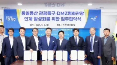 2024-06-03 23:57:38‘파주 통일동산 관광특구 활성화’ 위해 4개 기관 맞손 - 파주시-장단콩웰빙마루-파주디엠지곤돌라-오두산통일전망대 업무 협약 체결