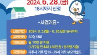 2024-06-04 00:03:57파주시, 청년 월세 지원 사업 하반기 참여자 모집 - 60명 선정, 연 최대 120만 원 지원
