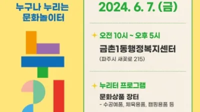 파주시, 6월 7일 ‘찾아가는 문화놀이터 누리터’개최 - 문화상품 장터, 원예 체험 등 즐길 거리 가득 파주시가 경기문화재단과의 협조로 ‘찾아가는 문화놀이터 누리터(이하 누리터)&rsqu...