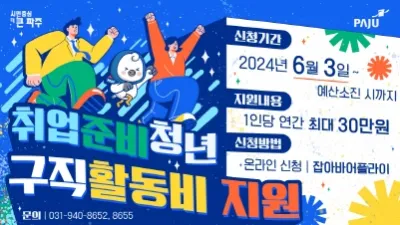 파주시, 취업준비청년에게 구직활동비 지원…1인당 최대 30만 원 - 학원 수강료, 면접 비용 등 지원, 6월 3일부터 신청받아 파주시가 고물가로 경제적 어려움을 겪는 취업준비 청년들에게 수강료나 면접 소요 비용 등 구직...
