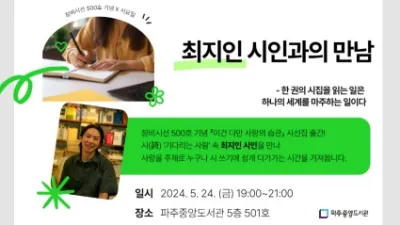 2024-05-08 03:10:40파주 중앙도서관, 5월 24일‘최지인 시인과의 만남’