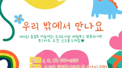 파주시 조리도서관, 5월 18일 밖으로 나온 도서관 운영 파주시 조리도서관은 5월 18일 열리는 제19회 통일로 미술대회에서 체험관을 운영한다. 이번 체험관 운영은 북 스타트 주간을 홍보하고 문화 프로그램 등을 제공하는...