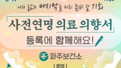 파주 운정종합사회복지관 어르신 대상, 연명의료결정제도 교육 파주보건소는 4월 23일 운정종합사회복지관 어르신 및 직원 등 30여 명을 대상으로 연명의료결정제도 및 장기기증 희망등록 교육을 실시했다. 사전연명의료의향서는 ...