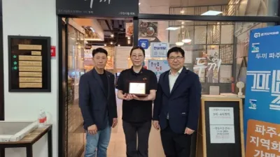 파주 문산읍 재능기부 행복나눔가게 현판식, 감사패 전달 파주시 문산읍은 24일 명랑핫도그 파주 문산점을 ‘재능기부 행복나눔가게 11호점’으로 지정하는 현판식을 개최하고, 8호점 두끼떡볶이 파주문산점에는 감사패를...