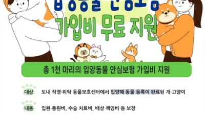 “반려동물, 이제 안심하고 키우세요” 경기도, 유기동물 입양자에게 반려동물 보험가입 무료 지원 - 경기도 관내 직영·위탁 동물보호센터에서 유기동물 입양 시 펫보험 무료 가입 - 동물등록이 완료된 개·고양이 대상...