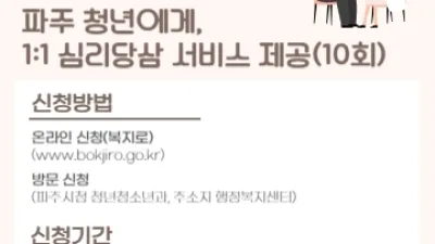 마음 아플 때 찾아오세요! 청년마음건강 상담 지원 - 파주시 청년 마음건강 지원사업 이용자 모집 파주시가 우울·불안 등 다양한 정서적 어려움을 겪고 있는 청년들에게 맞춤형 심리상담 서비스를 제공해 청년들이 건강한 사회구...