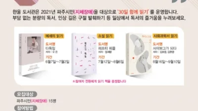 파주시 한울도서관, 2021년 지체장애인 온라인 독서프로그램‘30일 함께읽기’운영 파주시 한울도서관은 문화체육관광부가 주최하고 국립장애인도서관이 주관하는 ‘공공도서관 장애인 독서문화프로그램&rsquo...