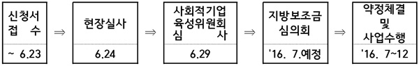 신청방법은 6월 23일까지 파주시청 지역경제과 사회적기업팀에 방문 접수해야 하며 선정절차는 신청서류 접수 후 현장실사와 파주시 심의를 거쳐 확정 된다.