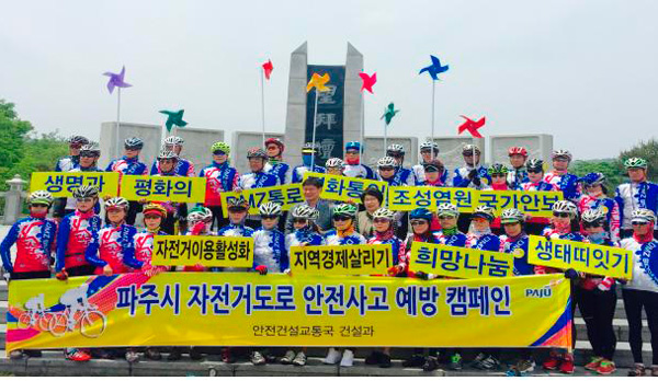 한편, 파주시는 이번 행사에서 자전거도로 안전사고 예방 캠페인을 병행했다. 자전거 이용시 과속 금지, 음주 후 라이딩 금지, 주행 중 이어폰, 휴대폰 사용 NO, 야간 전조등 부착 등 구호를 외치며 안전한 자전거 이용이 되도록 홍보활동을 전개했다.