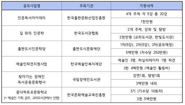 파주 교하도서관이 공모지원사업 5관왕을 달성했다. ‘인문독서아카데미’, ‘길 위의 인문학’, ‘출판도시인문학당’, ‘예술인파견지원사업’, ‘찾아가는 장애인 독서운동문화행사’ 공모사업에 모두 선정되어 다채로운 인문학 강좌, 탐방 프로그램, 예술 프로그램을 운영한다. 행복학교문화예술교육사업단이 기획, 공모선정된 ‘꿈다락 토요문화학교’ ‘책이랑 놀아난 애니메이션’도 교하도서관에서 작년에 이어 2년 연속 운영하게 되어, 공모사업으로 추진하게 된 예산액만 올 한 해 교하도서관(한빛, 해솔 분관 포함) 문화행사 관련예산의 2배를 훌쩍 넘는 총 1억 7백여만원에 이른다.