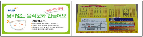 이번 사업은 5월부터 7월까지 추진하며 사업비 2백만원을 들여 중국음식, 치킨집 등 배달업소 20곳에 스티커 24,000장을 배포한다. 배달박스(완제품) 상단에 스티커를 부착하도록 하고, 주문표에도 음식낭비를 줄이자는 문구를 삽입한다.