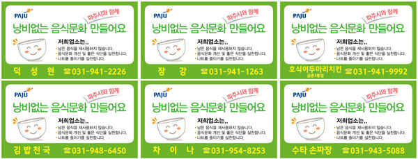 파주시가 낭비없는 음식문화 만들기 스티커를 제작 배포한다고 밝혔다. 배달영업소 등 지역자원을 활용해 음식문화 인식전환의 계기를 마련하고 위생관련 정보도 제공한다.