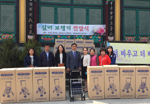 석천사에서는 매년 몸이 불편하여 이동에 어려움을 겪는 저소득층 노인들에게 보행보조기(실버카)를 지원하고 있으며, 올해는 총 20대의 보행보조기(실버카)를 기탁했으며, 지난 7일 전달식을 가졌다.