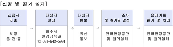 가구당 지원 금액은 최대 336만원으로 슬레이트 주택 소유자가 본 사업에 참여 신청을 하면, 파주시는 지원대상자를 선정해 한국환경공단에 철거를 의뢰하며, 한국환경공단과 철거업체가 일정을 잡아 해당 주택의 슬레이트 해체·철거 및 처리를 실시하게 된다. 이때, 처리비용이 366만원을 초과하는 주택의 경우는 소유자의 자부담이 발생할 수 있다.