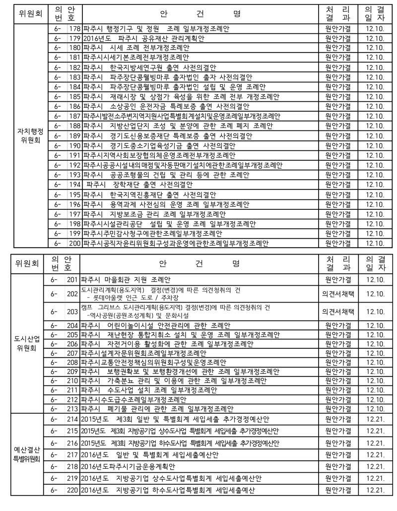 ○ 파주시의회는 이번 제2차 정례회 폐회를 끝으로 2015년도 전체 회기일정을 모두 마쳤으며 다음 회기는 2016년도 첫 번째 회의로서 1월 12일부터 개회하여, 시정업무보고 청취 및 일반안건 심사를 할 예정이다.