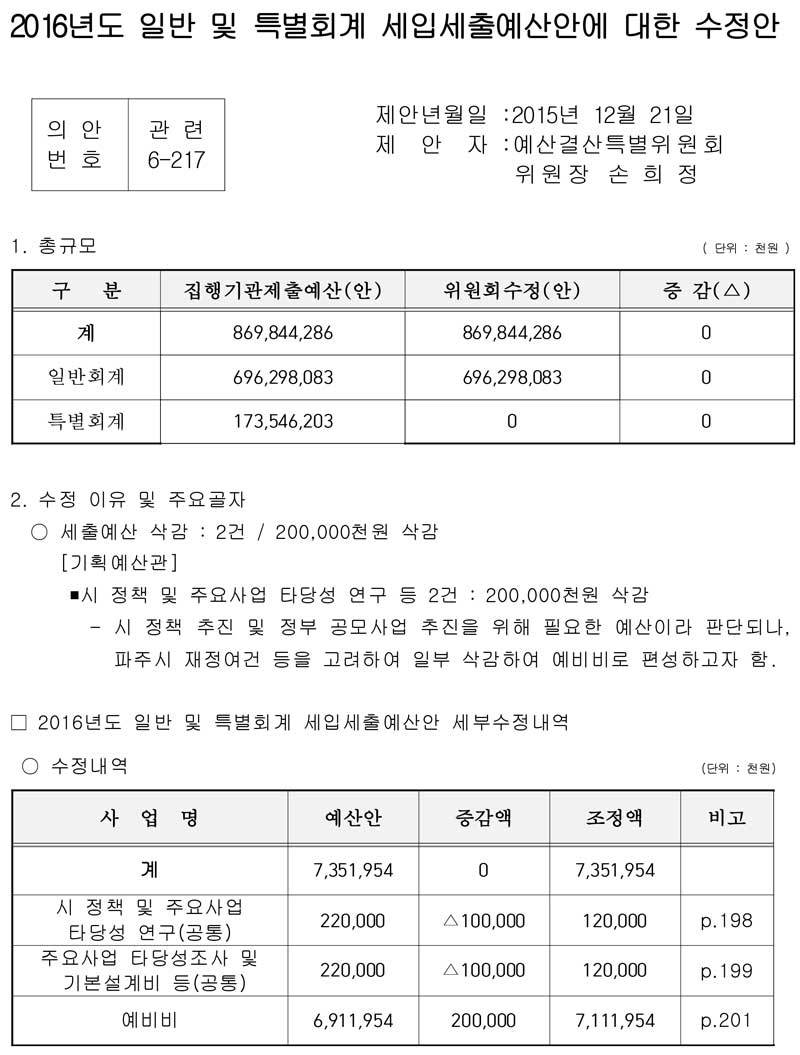 ○ 지금부터 제출된 안건 중 일괄 상정된 ‘2016년도 일반 및 특별회계 세입ㆍ세출 예산 안’, ‘2016년도 지방공기업 상수도사업 특별회계 세입ㆍ세출 예산 안’, ‘2016년도 지방공기업 하수도사업 특별회계 세입ㆍ세출 예산 안’, ‘2016년도 파주시 기금운용 계획 안’에 대하여 제안 설명을 드리겠습니다.