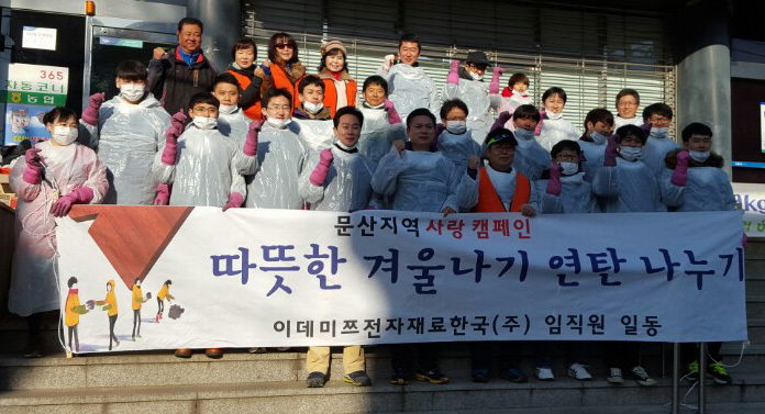 저소득층 5가구에 연탄 1,000여장을 직접 배달하는 이번 봉사활동에는 쌀쌀한 날씨에도 불구하고 이데미쯔전자재료한국주식회사 임직원 20여명이 참여해 이웃돕기를 위해 구슬땀을 흘렸다. 이 중에는 일본 본사에서 한국지사로 파견된 일본인 직원들도 다수 참여하여 눈길을 끌었다.